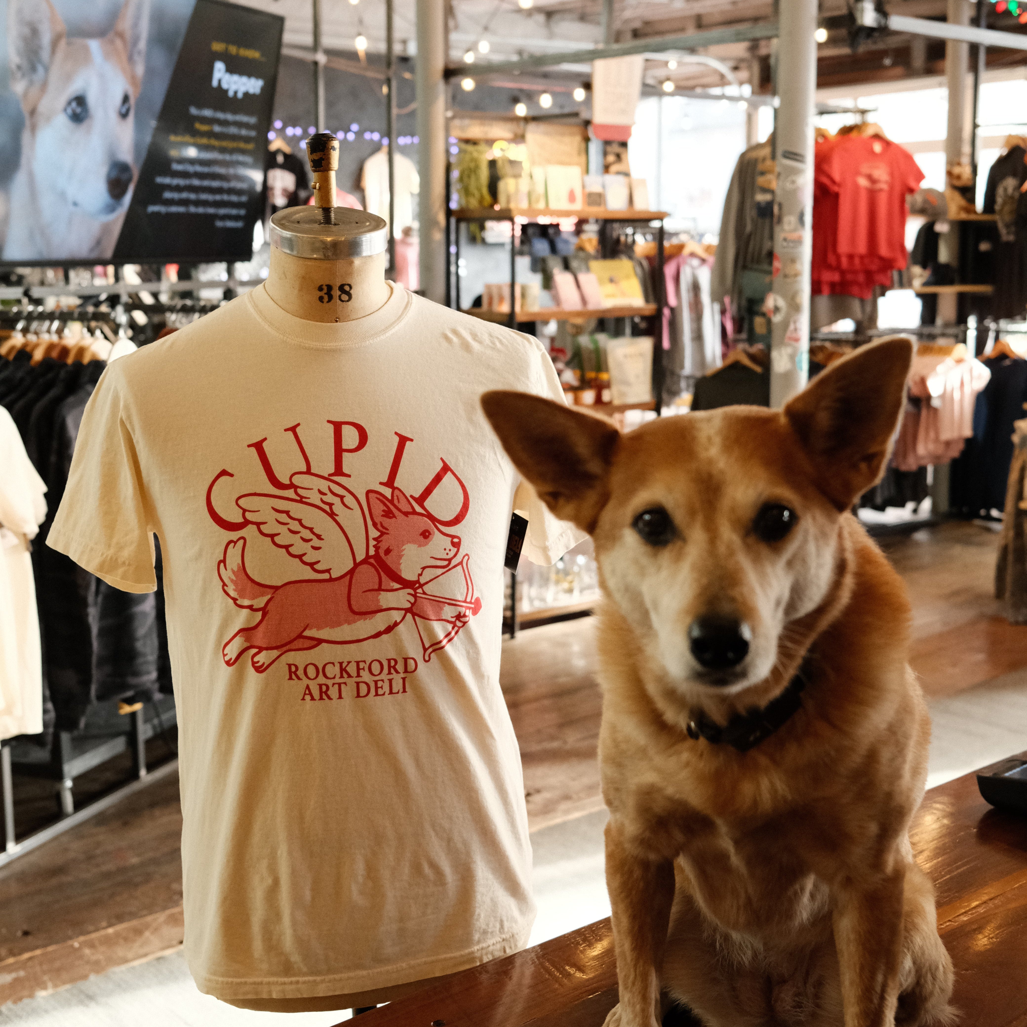 Meet Pepper in her cutest role yet...cupid with a mission! This tee celebrates your favorite shop sweetheart as she spreads love and joy, just like she does every day around Rockford Art Deli. Featuring bold, playful artwork that captures Pepper's heart-melting charm, it's the perfect pick for dog lovers and anyone who believes in spreading good vibes. Wear it and share the Pepper magic wherever you go.