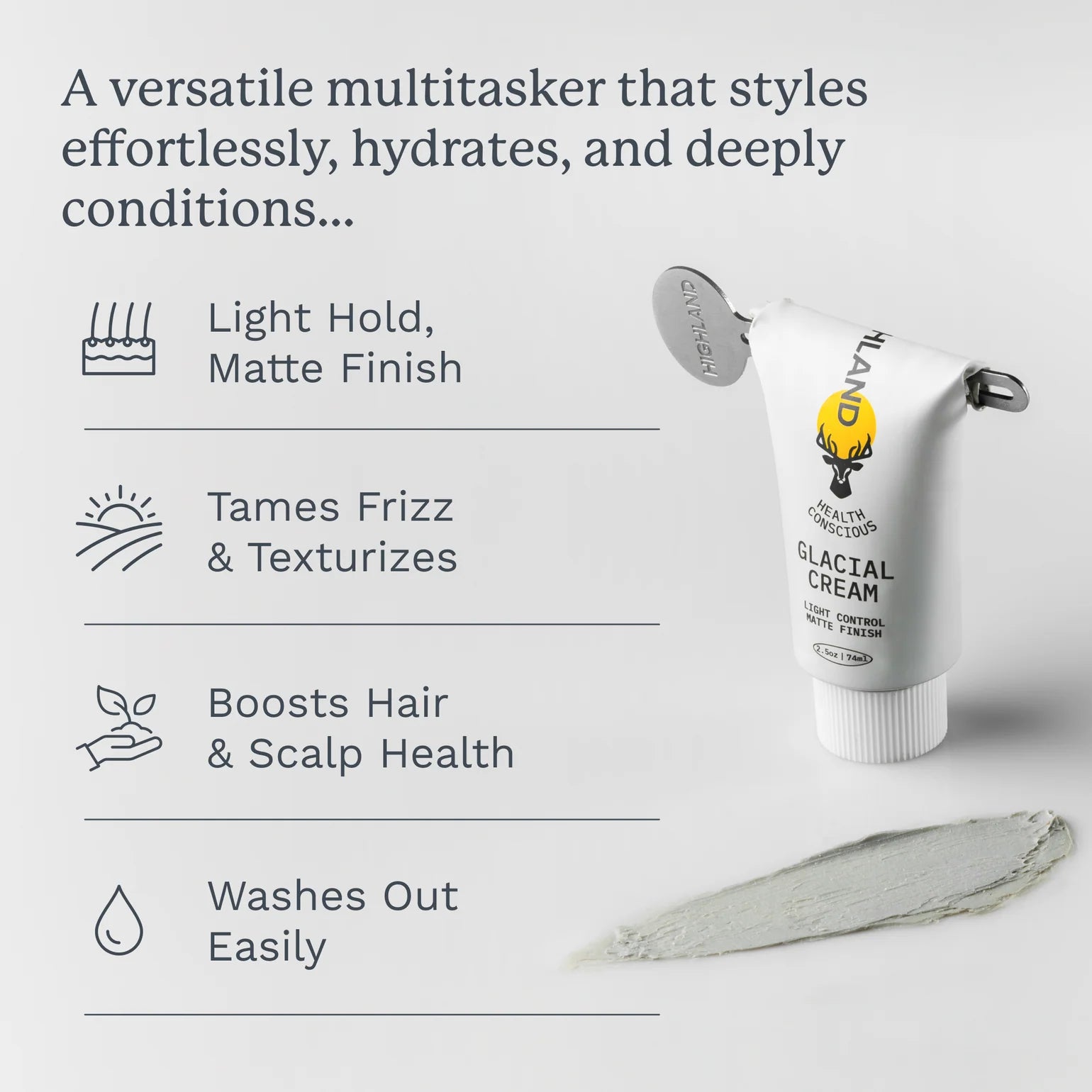 It's here. Our new Glacial Cream is a versatile multitasker that deeply conditions and tames frizz while enhancing your hair's natural texture. Developed for hydration and smooth styling, our all-natural formula helps you to effortlessly achieve happier hair.